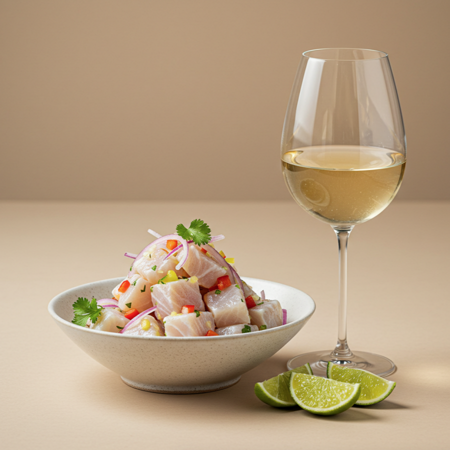 와인과 페어링하기 까다로운 또 하나의 요리는 바로 세비체(ceviche)인데, 일반적으로 시트러스 느낌이 강한 와인보다는 아로마틱한 화이트 와인이 잘 어울린다. 세비체의 마리네이드(양념)가 와인의 시트러스 풍미를 압도하는 경향이 있기 때문이다. 하지만 세비체는 다른 요리와 함께 제공되는 경우가 많기 때문에, 음식의 전체적인 스타일에 맞는 와인을 찾는 것이 중요하다.